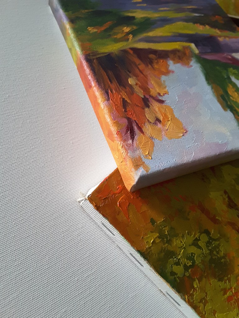 При така наречените 3D платна, платното е захванато за подрамката от обратната й страна. Това позволява изображението да продължи от лицевата към тясната страна на платното и картината да има завършен вид, дори и без външна рамка. Аз лично предпочитам винаги да рамкирам готовите картини, дори и когато съм рисувала на 3D платно. Външната рамка придава допълнителна красота и завършеност на картината.